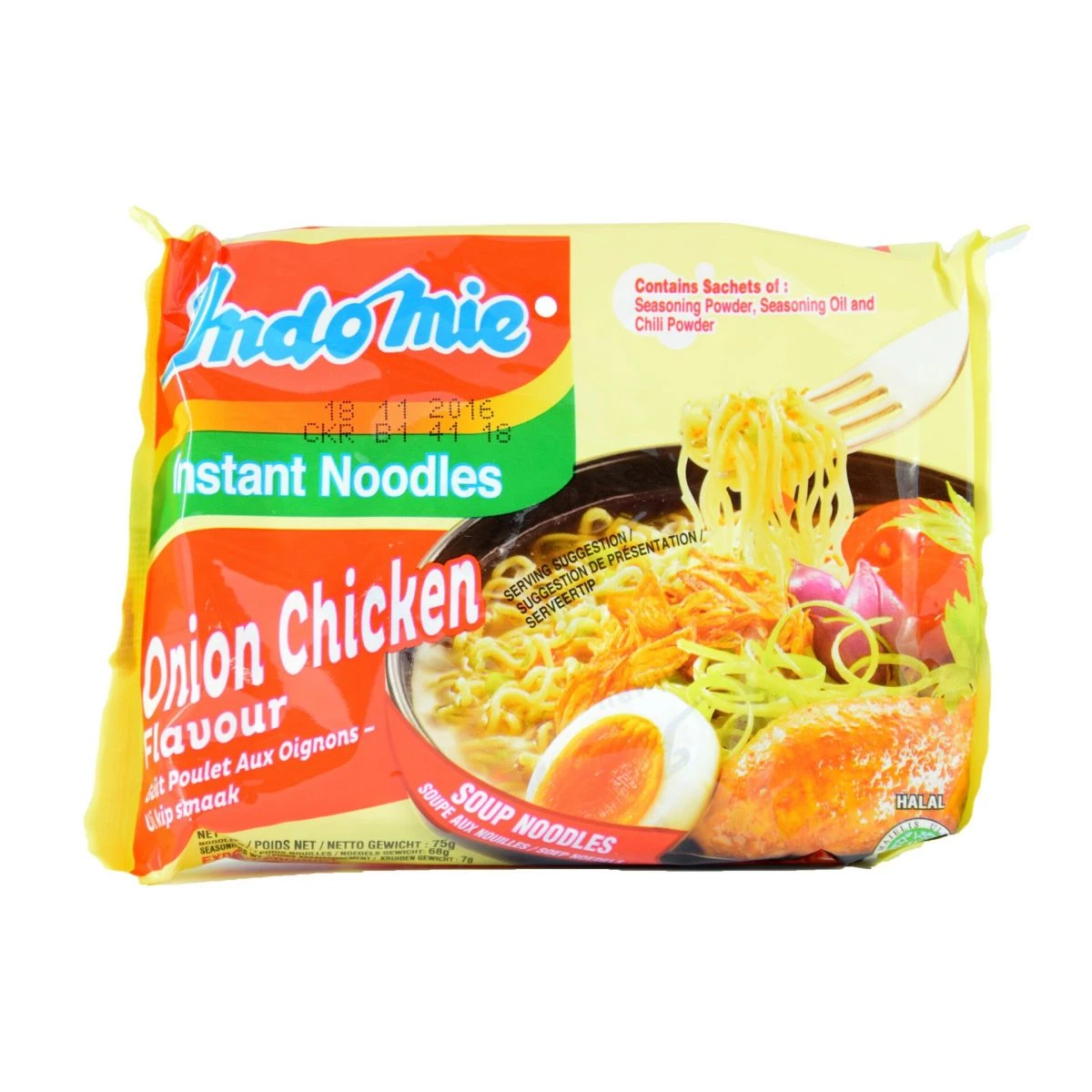 | Ingredienten | Noedels: Tarwebloem (70%), Plantaardige Olie (bevat Anti-Oxidant E319), Zout, Zuurteregelaars (E451, E501, E500), Verdikkingsmiddel (E412), Kleur (E101). Kruiding: Zout, Smaakversterker (E621, E627, E631), Suiker, Peper, Knoflook, Gistextract, Prei, Ui, Poeder, Zuurteregelaar (E330), Kunstmatige Kip, Smaak (1.0%). Olie: Plantaardige Olie (bevat Anti-Oxidant E319), Ui (0.1%). Chlipoeder. Allergenen Informatie: Bevat tarwemeel / gluten (zie dikgedrukt). Bewaren in koele en droge plaats. |